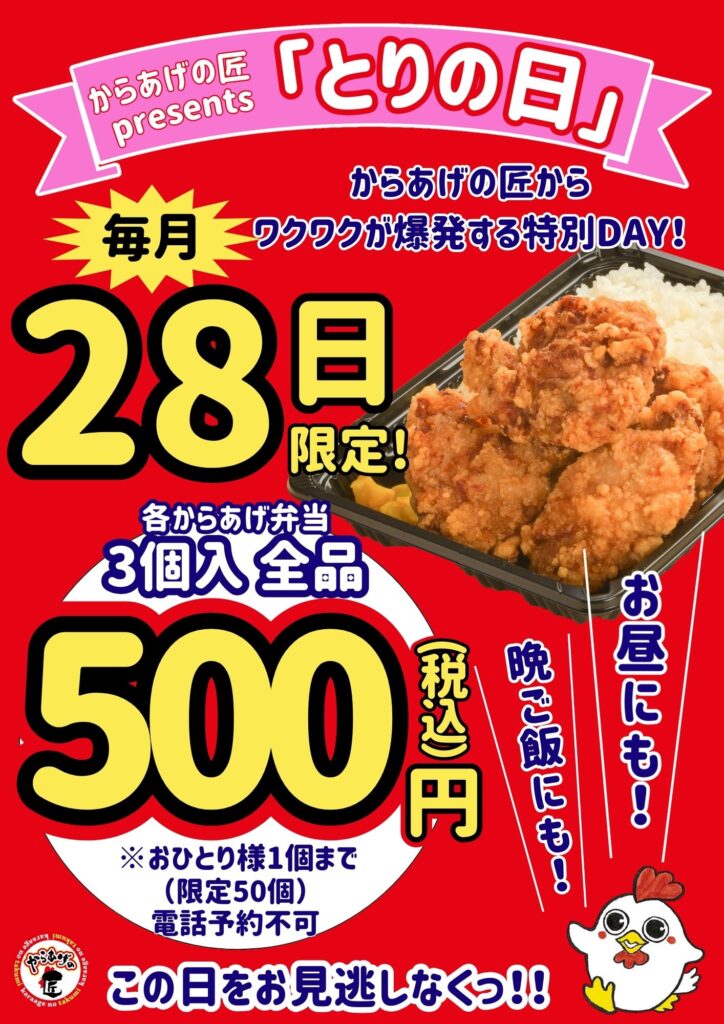 日頃より、からあげの匠をご利用いただきまして誠にありがとうございます。 1月28日(水)は、毎月28日恒例! からあげの匠の「とりの日」を開催いたします。 ※今回より「とりの日」の内容が変更になっております